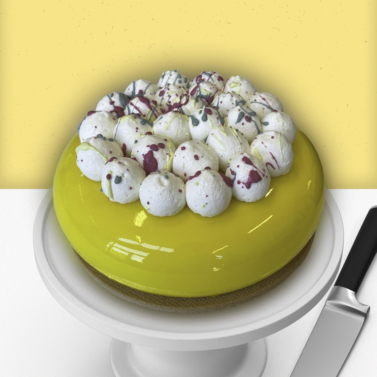 A layer of lime mousse then gives way to a beautiful yellow glaze, which is then topped with playful coconut mousse decoration.